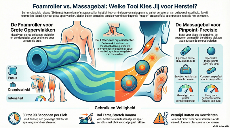 Vaak zie je sporters foam rollen met een grote foam roll. Dit is handig voor een lichte massage van grote spieren. Echter voor diepgaande massage van trigger points is het foam rollen met een tennisbal of andere klein balletje aan te raden.
